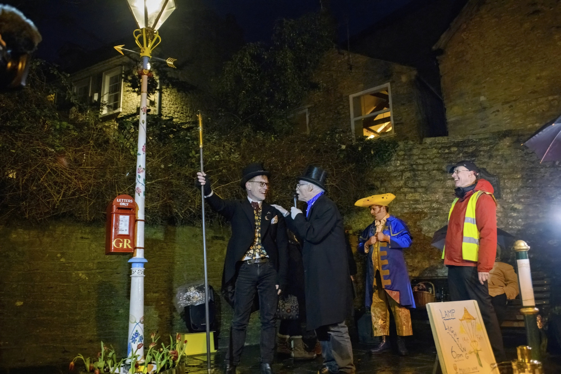 The 2026 ceremony, signalled by a Queen of Hearts rocket at 5.30pm, started with the gathering crowd being serenaded by accordian player Tom Woolman and the Selwood Bounds musicians, accompanied by the Selwood Bounds morris dancers who were captivating. At 6pm sharp the town crier, Martin Scott, exulted the crowd with words about love. Four poems were read by Jane Hughes, Mike Rogers, Caroline Rose and Roz Dace. Eddie Young, the new lamplighter, said a few words and lit the lamp! The mayor, Anita Collier, said the thanks and presented Reg Ling with a specially commisioned hand painted illustration, by Paul ‘Mutartis’ Boswell, which will be featured in the upcoming book about Reg and the creation of the Valentine Lamp, to be published later this year. Mulled wine and hot berry juice was imbibed. The weather was dry and mild, a much needed break in the long wet winter we had all endured. The crowd dispersed happy and full of love.