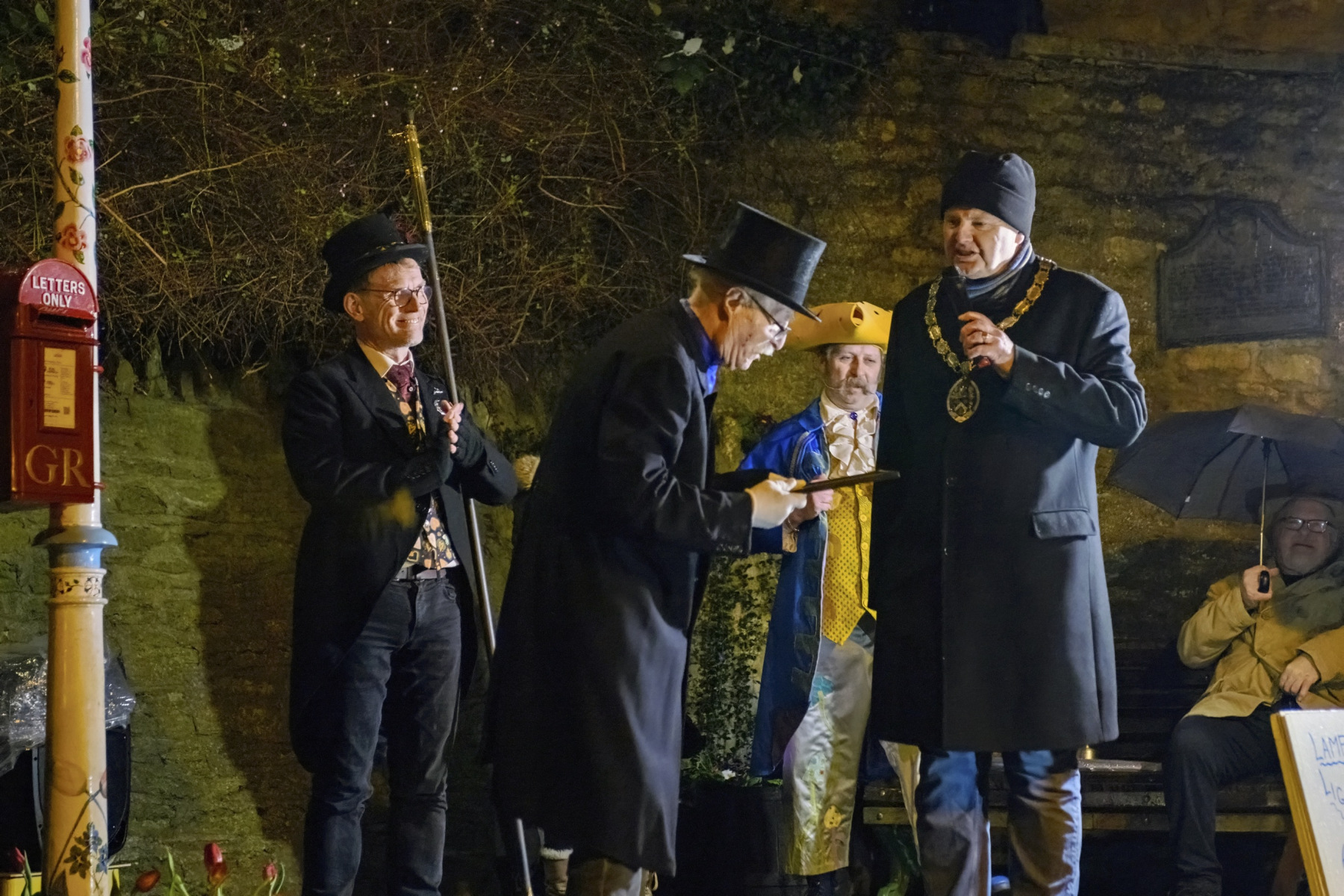 The 2025 ceremony, signalled by the traditional firework at 5.30pm, started with the gathering crowd being serenaded by an accordian player, Tom Woolman. At 6pm sharp the town crier, Martin Scott, exulted the crowd with words about love. Three poems were read. Reg Ling, the inventor, creator and custodian of the lamp for the last 32 years, handed over his lamp lighting duties to the new incumbent Eddie Young, who lit the lamp. The mayor, Andy Jones, presented Reg Ling with a civic award to commemorate his commitment and dedication. Mulled wine was imbibed. It was cold and rained but the record crowd left happy and full of love.