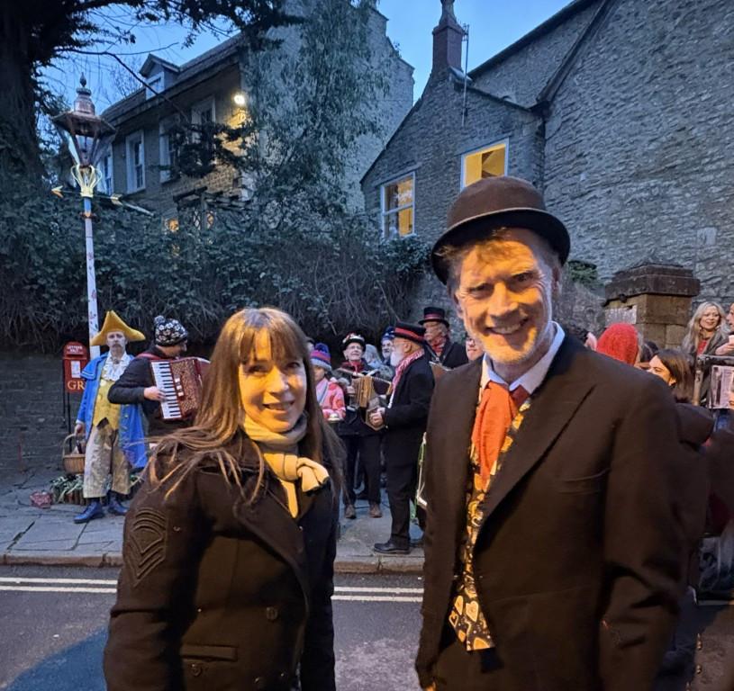 The 2026 ceremony, signalled by a Queen of Hearts rocket at 5.30pm, started with the gathering crowd being serenaded by accordian player Tom Woolman and the Selwood Bounds musicians, accompanied by the Selwood Bounds morris dancers who were captivating. At 6pm sharp the town crier, Martin Scott, exulted the crowd with words about love. Four poems were read by Jane Hughes, Mike Rogers, Caroline Rose and Roz Dace. Eddie Young, the new lamplighter, said a few words and lit the lamp! The mayor, Anita Collier, said the thanks and presented Reg Ling with a specially commisioned hand painted illustration, by Paul ‘Mutartis’ Boswell, which will be featured in the upcoming book about Reg and the creation of the Valentine Lamp, to be published later this year. Mulled wine and hot berry juice was imbibed. The weather was dry and mild, a much needed break in the long wet winter we had all endured. The crowd dispersed happy and full of love.